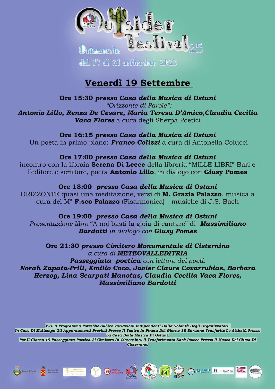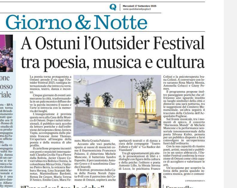 Del 17 al 21 de septiembre de 2025, la poesía se consolidó como eje cultural en el Valle d’Itria con el Outsider Festival, organizado por la Casa della Poesía Norah Zapata-Prill, con el patrocinio de los municipios de Ostuni y Cisternino y la colaboración de entidades culturales como Teatro Folletti e Folli, Teatro In Pineta, Studio Colizzi, MeteoValledItria/Museo del Clima, FIAB Cicloamici Mesagne, Amici della Musica y La Radice dei Viandanti.
