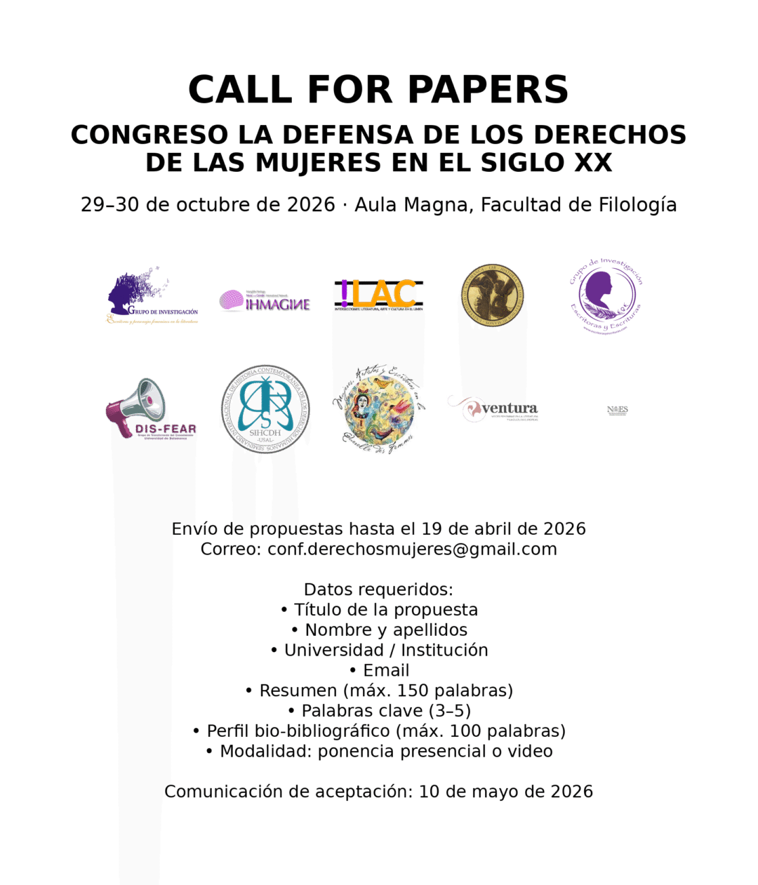 CONGRESO INTERNACIONAL: LA DEFENSA DE LOS DERECHOS DE LAS MUJERES EN EL SIGLO XX Cuándo: 29–30 de octubre de 2026Dónde: Aula Magna, Facultad de Filología OBJETIVOS Ante la proximidad del Día Internacional de las Defensoras de Derechos Humanos que se celebra cada 29 de noviembre, desde el año 2005, para rendir homenaje a las mujeres … Seguir leyendo “Convocatoria abierta para pensar y visibilizar las luchas de las mujeres del siglo XX: historia, literatura, arte y derechos en diálogo.”