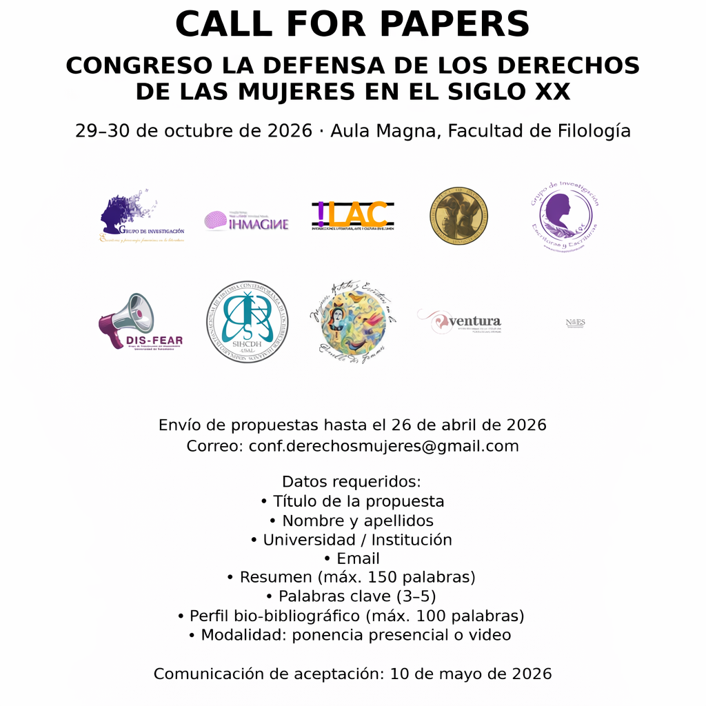 CONGRESO INTERNACIONAL: LA DEFENSA DE LOS DERECHOS DE LAS MUJERES EN EL SIGLO XX Cuándo: 29–30 de octubre de 2026Dónde: Aula Magna, Facultad de Filología OBJETIVOS Ante la proximidad del Día Internacional de las Defensoras de Derechos Humanos que se celebra cada 29 de noviembre, desde el año 2005, para rendir homenaje a las mujeres … Seguir leyendo “Convocatoria abierta para pensar y visibilizar las luchas de las mujeres del siglo XX: historia, literatura, arte y derechos en diálogo.”
